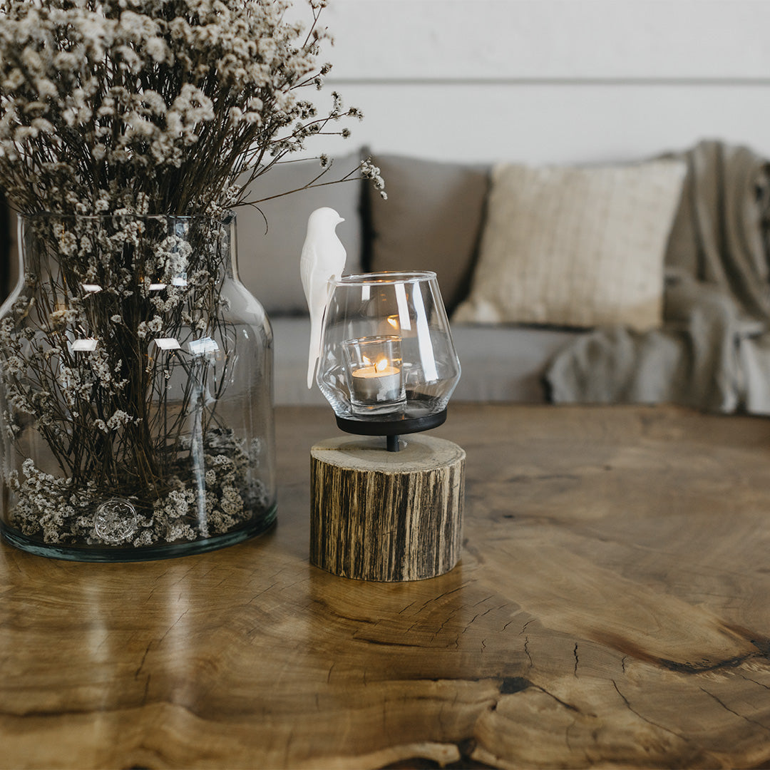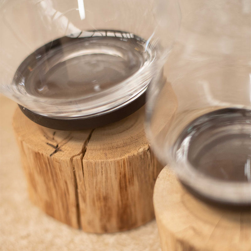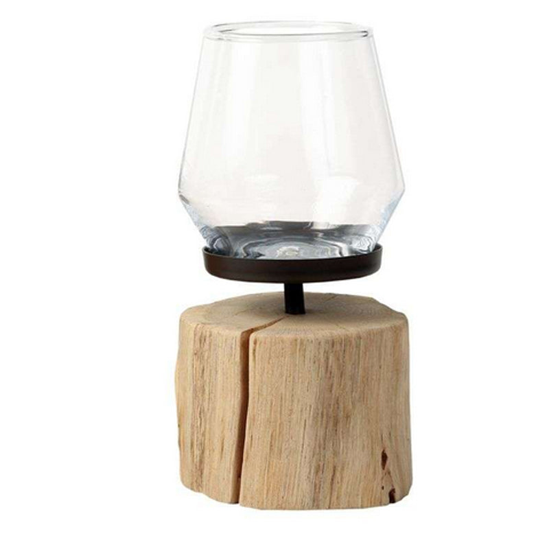 Porta Velas em vidro com base em madeira de Carvalho Natural