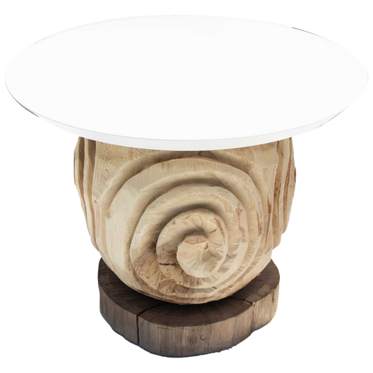 Mesa de Apoio com bola gravada em Teca e tampo lacado a branco