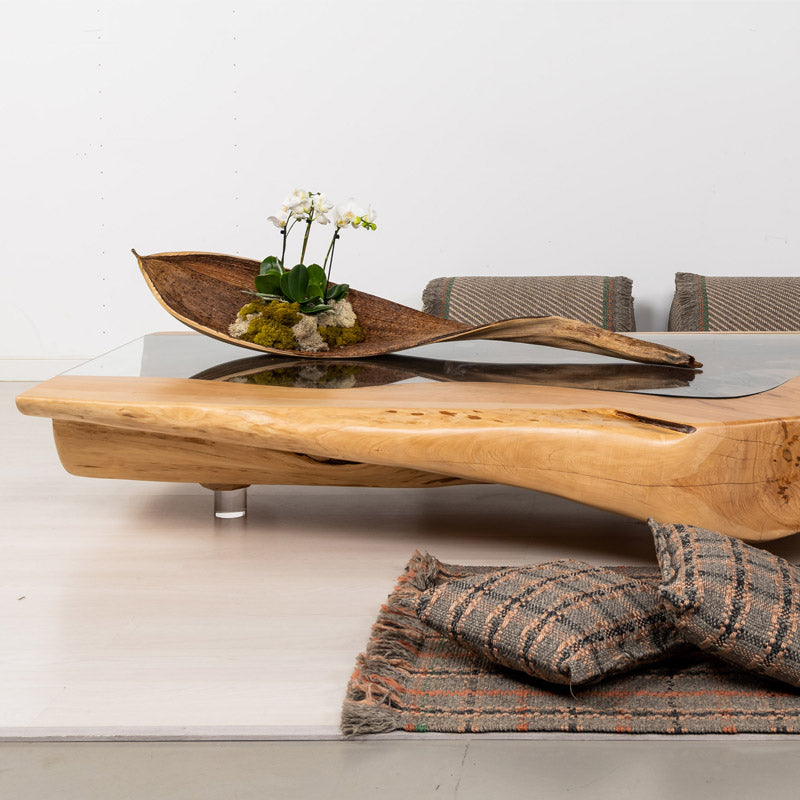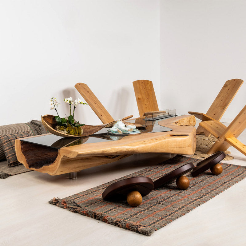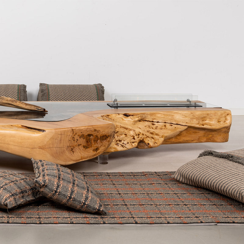Mesa de Centro em Madeira Natural de Cedro, com cerca de 150 anos. A peça é composta por um tronco de cedro completamente seco, recebendo a devida limpeza e tratamento. O vidro foi recortado á medida respeitando as curvas da madeira, criando um efeito de contorno. Por último, a lareira de bio etanol foi adicionada com o objetivo de criar uma sensação de conforto e que torna qualquer sala ou espaço mais quente e confortável.