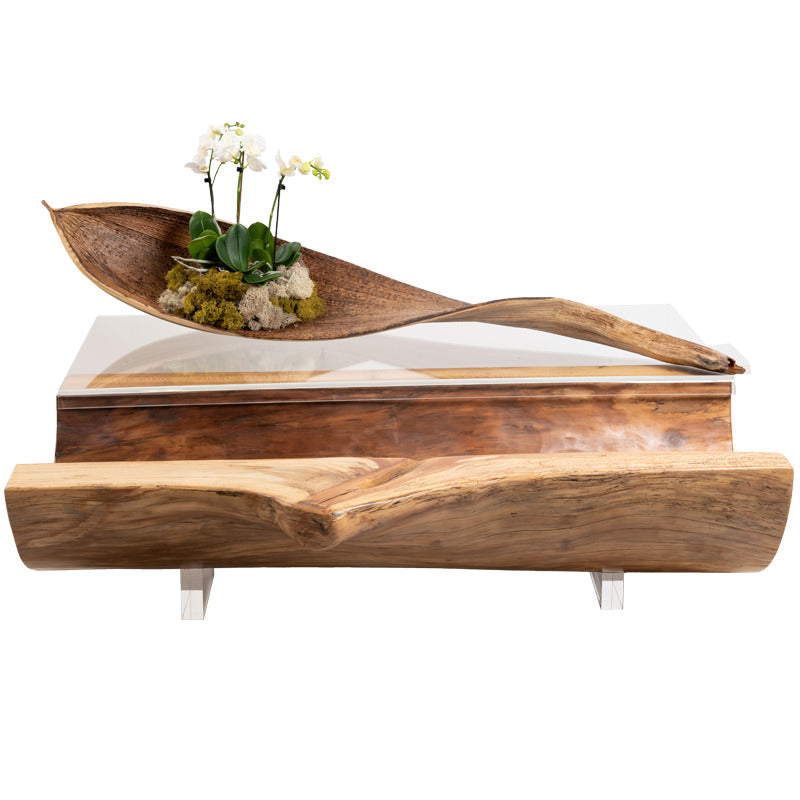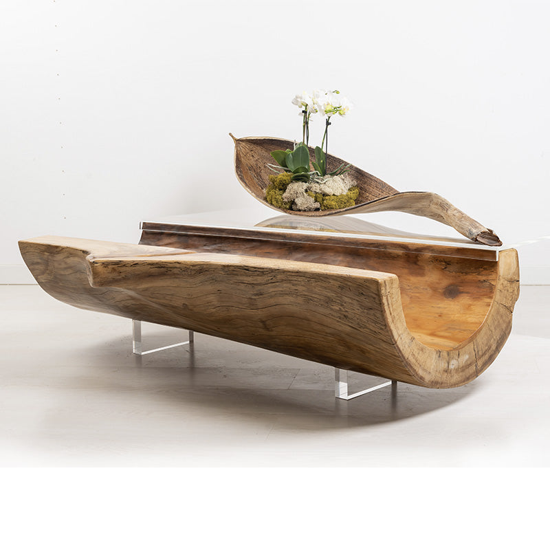 Mesa de Centro em Madeira Natural de Plátano, com cerca de 120 anos, com pés em acrílico.