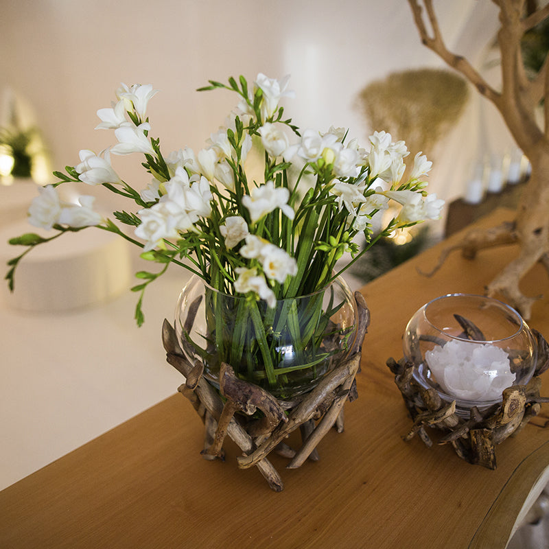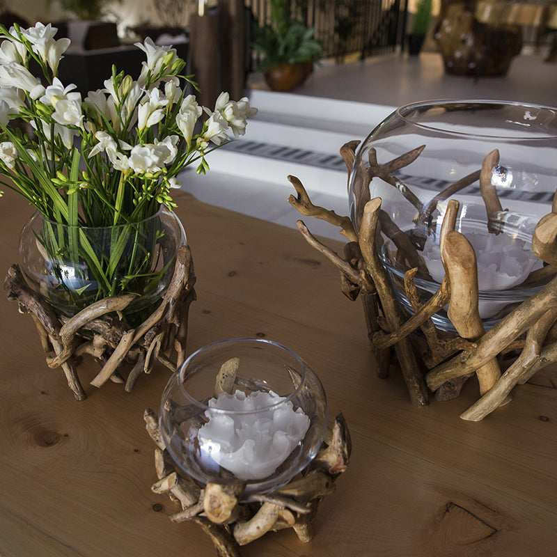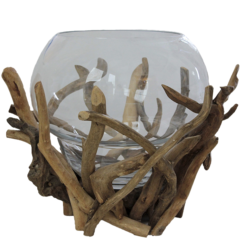 Vase or Candle Holder in Natural Wood, with glass bowl