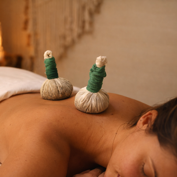 Massagem de relaxamento com bolsinhas aromáticas aquecidas. O calor suave e os aromas naturais das plantas envolvem o corpo, aliviam tensões musculares, estimulam a circulação local e proporcionam uma sensação profunda de conforto.